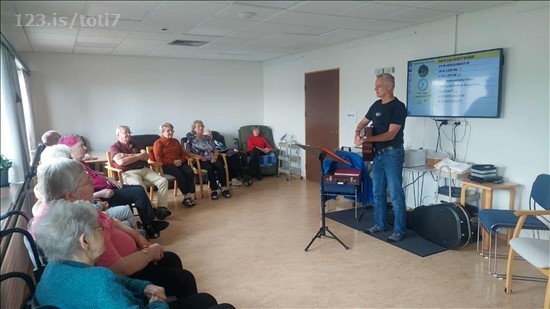 Fyrsta vikan í september var heldur tíðindaríkari en sú síðasta í ágúst. Hófst með rólegum sunnudegi og svo kennslu í MTR fram að föstudegi, einnig unnið að fréttaskrifum og ýmiskonar skráningu að vanda. Heimsótti einnig ljóðaklúbb á dvalarheimilinu Hornbrekku á Ólafsfirði á mánudeginum (sjá mynd) og flutti þeim eigin lög við ljóð ýmissa skálda, var það fyrsti viðburðurinn í ljóðahátíðinni Haustglæður sem ég stýri nítjánda árið í röð.