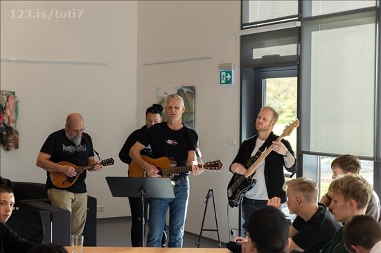 Vikan 21. - 27. september var lituð af tónlist, eins og flestar vikur í lífi mínu síðustu áratugina svo sem, sem sagt engar nýjar fréttir. Vikan hófst þó á rólegum sunnudegi þar sem verið var að undirbúa næstu kennsluviku og dudda við eitt og annað eins og að skrifa fréttir og vinna að skrásetningu, huga að heimilinu og svona þessu hefðbundna. Svo tók skólalífið við á mánudegi og á þriðjudegi vorum við með dagskrá í Menntaskólanum á Tröllaskaga í tilefni af Alþjóðadegi friðar. Þar steig Hamingjubandið á stokk og ég sem fyrr sá sem stýrði lagavali, sem var í takti við þema dagsins, og sá um söng, kynningar og gítarspil með flott fólk með mér úr röðum kennara og nemenda.